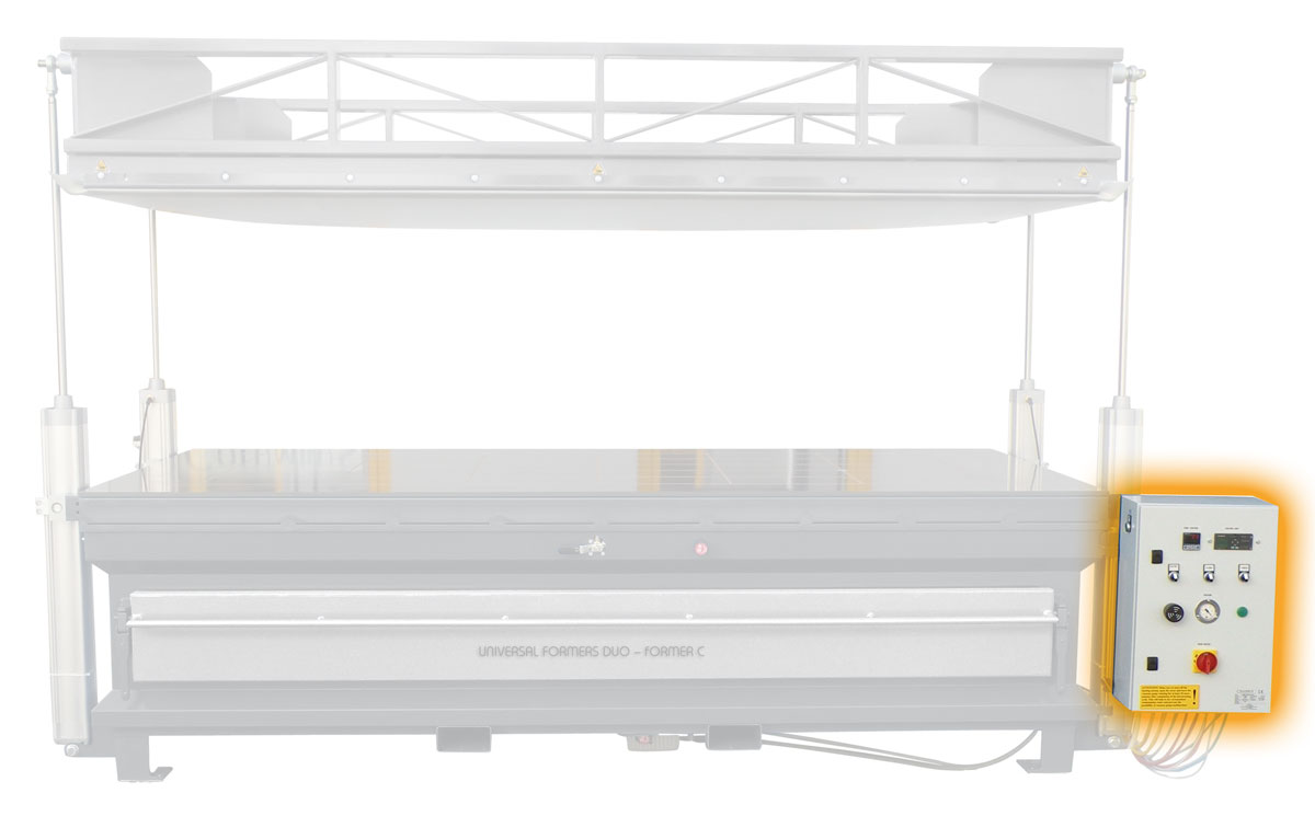 (Usable area: approx. 2600 x 1200 mm | material thickness: 0 – 70 mm) CAS (Controlled Air Stream) heating system | heating power: 16 kW, 400 V, 50/60 Hz | 2 circulating hot air fans | Jumo variable temperature control up to + 230 °C | 4“ Siemens touch panel incl. heating time control, timer and alarm | pull-out working surface with grating, grid 30 x 30 mm
