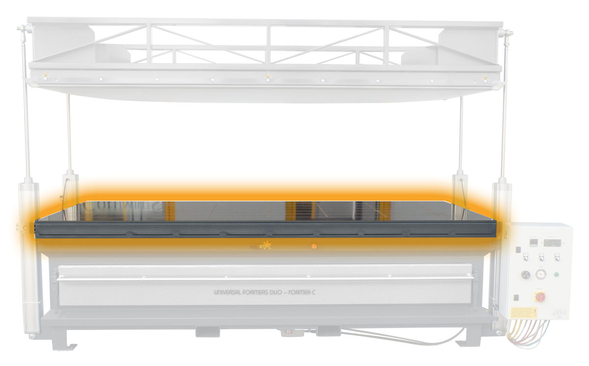 Incl. gas springs (dimensions inside the frame: approx. 2880 x 1280 mm): 25 m³ high-performance vacuum pump, pressure up to 900 mbar (9 t/m2) | hinged control cabinet on the right side | mechanical vacuum pressure regulator | highly elastic silicone membrane high-performance, up to 230 °C | membrane fast-change system | robust phenolic resin working surface with integrated air suction channels, heat resistant up to 160 °C | connector for external vacuum bag | swivel castors