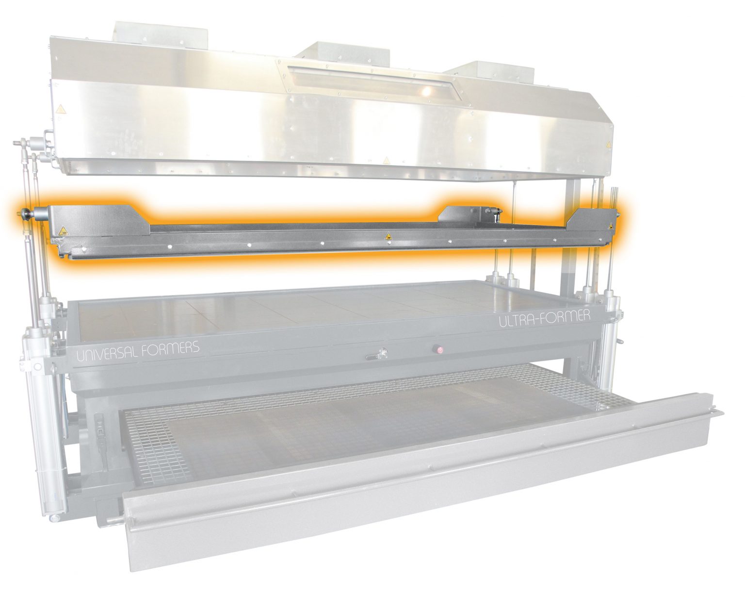 Vacuum table with independent VERTICAL opening of the membrane frame and heating hood with pneumatic cylinders, stroke 650 mm